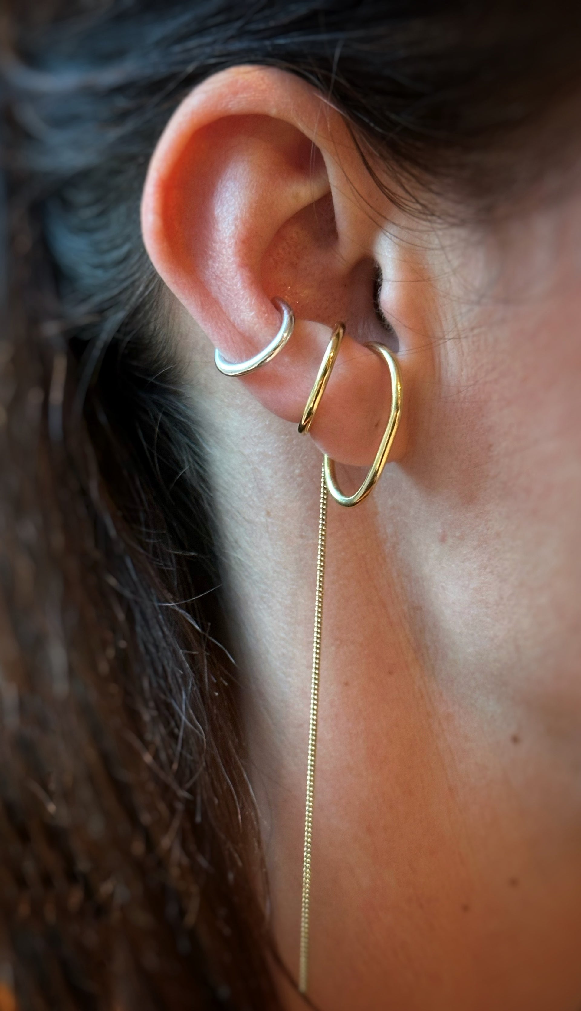 Een elegante ear cuff met een fijn kettinkje, verkrijgbaar in zilver of verguld zilver.